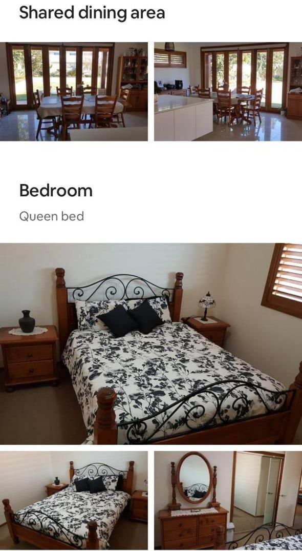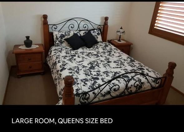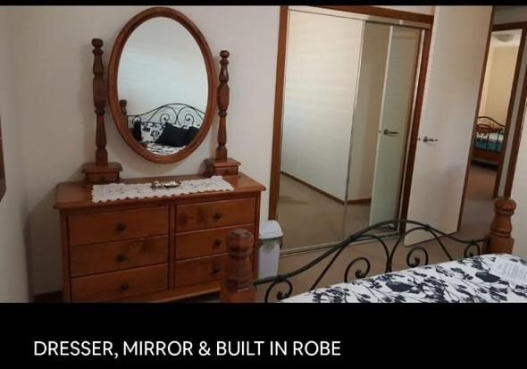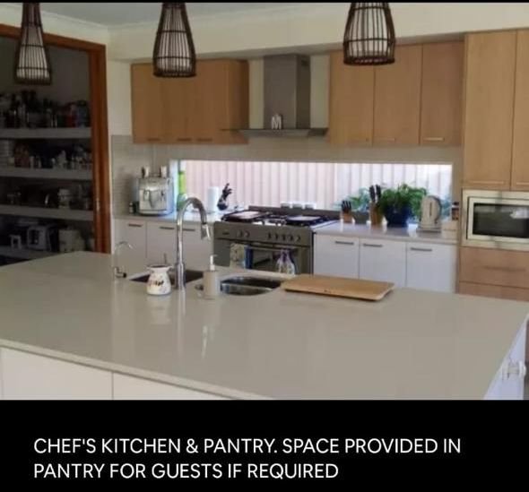 Large furnished room upstairs, Queen size bed, side tables, dresser, mirror with built in robe. Living areas are large and open plan. The house has a chef’s kitchen with island bench. There are two large lounge rooms. Lounge room downstairs has a 7 speaker in